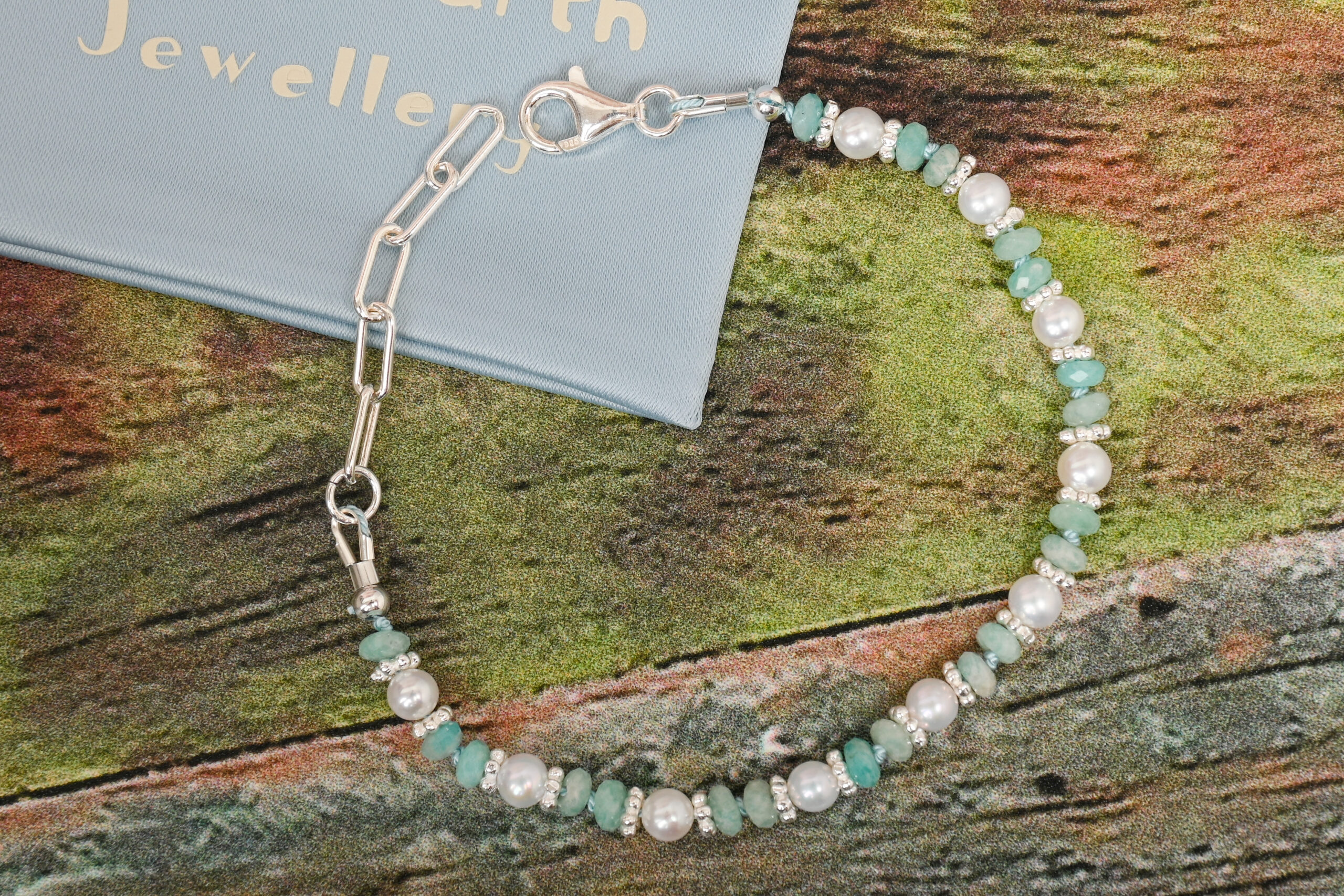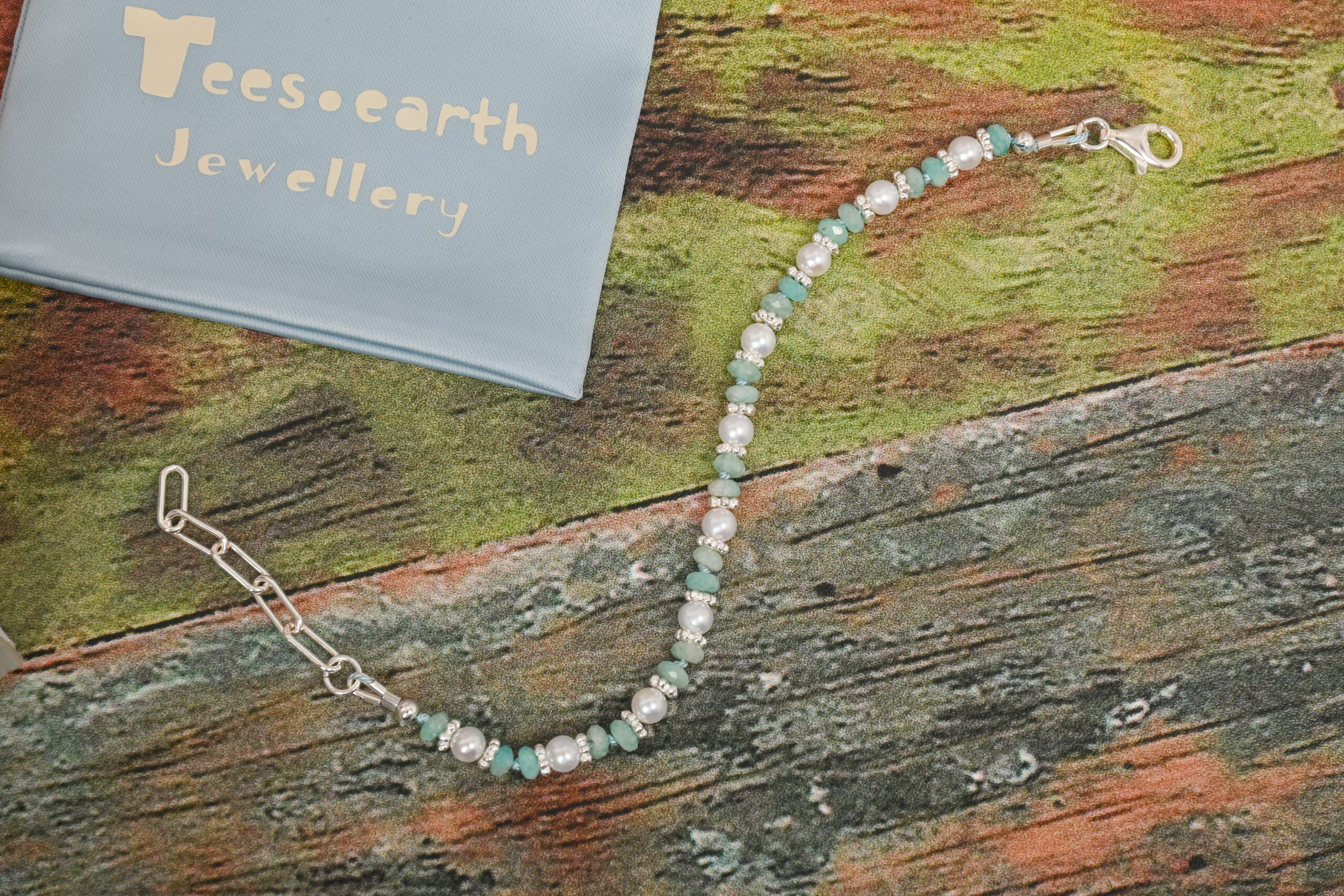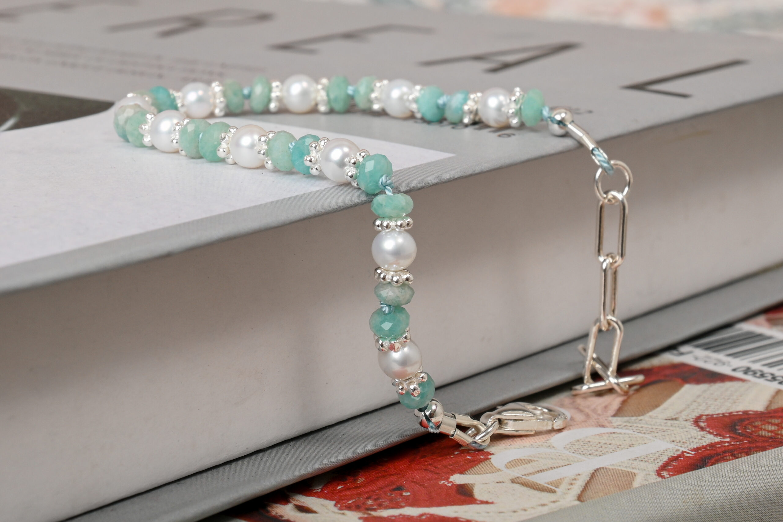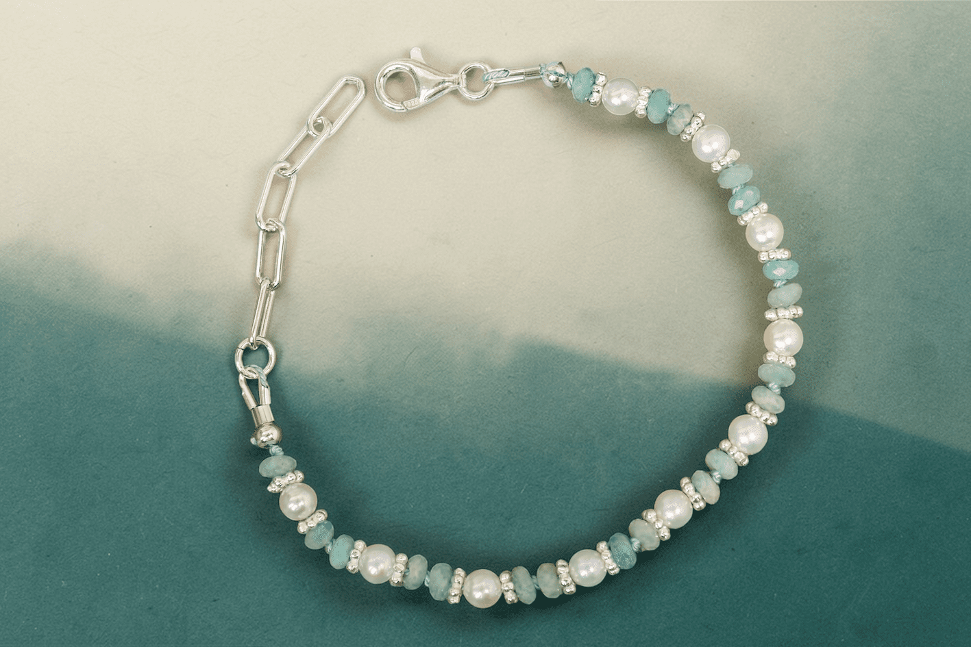 A delicate Akoya pearl and teal gemstone bracelet embroidered on a thread knotted at regular intervals, creating an irresistibly charming impression.
